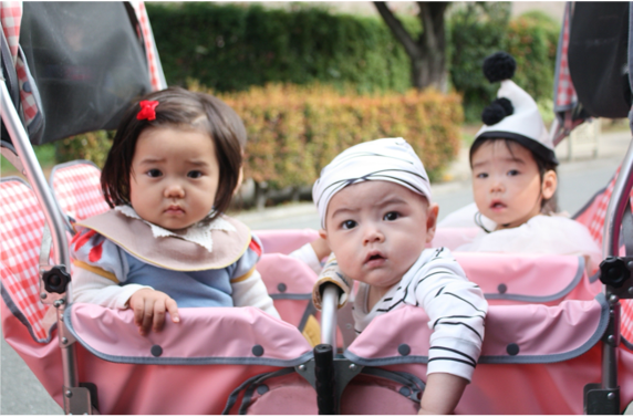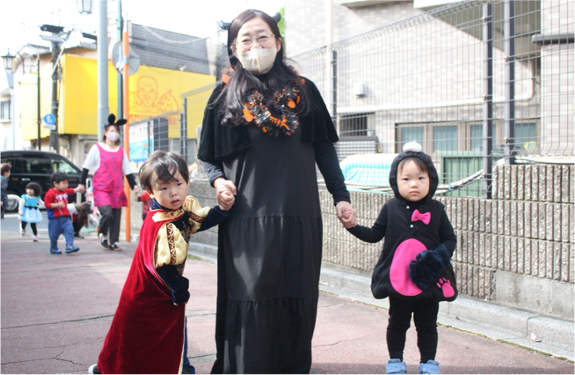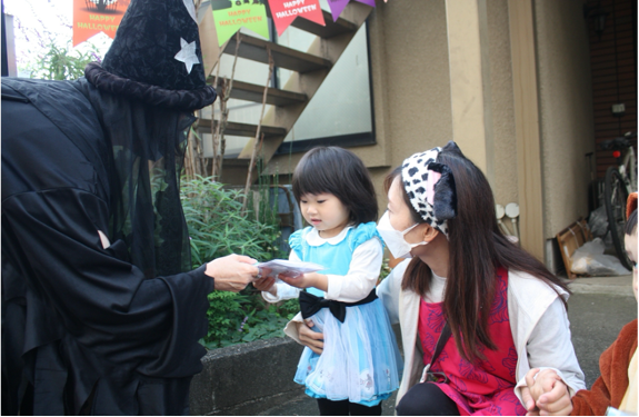 【Happy Halloween】仮装した子どもたちは魔女に扮した英語の先生からお菓子をもらい嬉しそうでした。